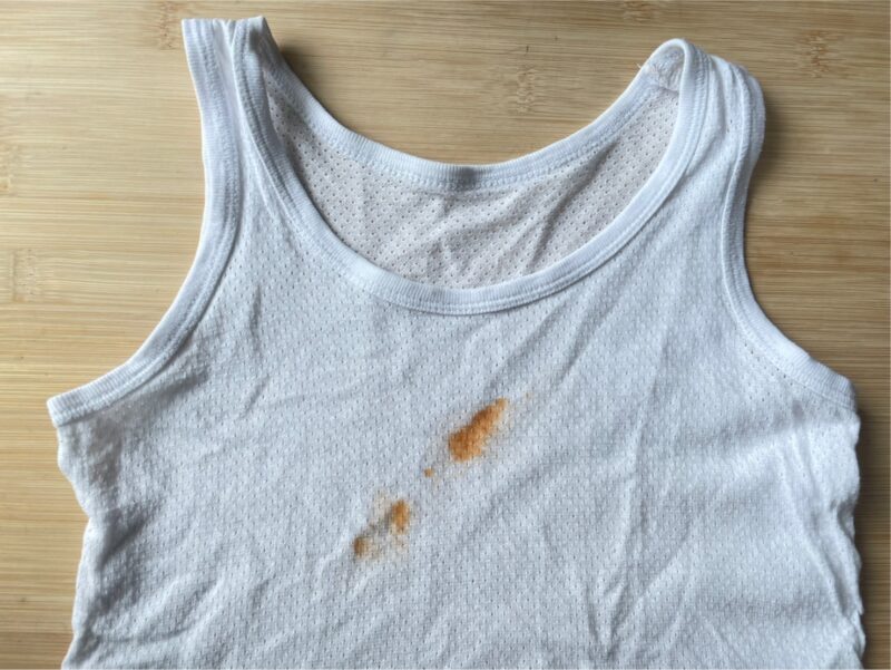 ミートソースのシミをウタマロ+オキシで処理した結果、かなり薄くなりました。