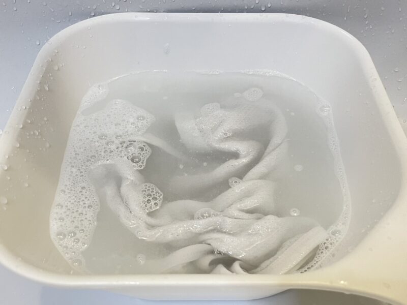 【オキシクリーン】を30〜40℃のぬるま湯に溶かし、肌着を30分ほど浸け置きします。