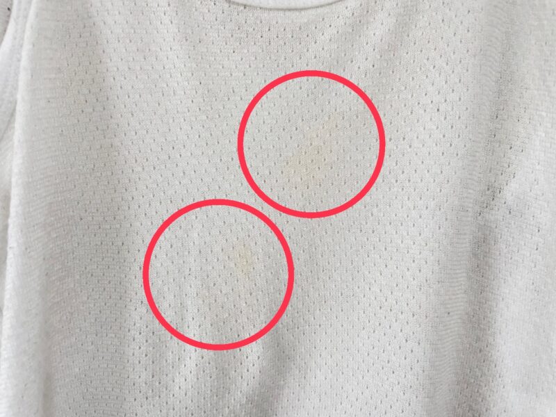 ウタマロでこすり洗い→オキシ漬けの流れで、目立つシミはしっかり薄くなりましたが、よく見ると少し残っています。